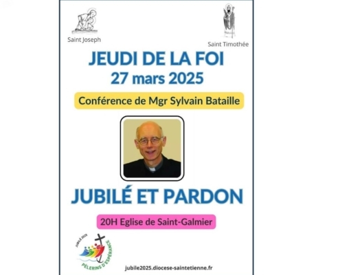 EditoNous sommes tous conviés jeudi 27 mars à 20h, à l'église de Saint-Galmier pour un enseignement de Mgr Sylvain Bataille sur le thème du Jubilé et pardon.Venez nombreux dans l'espérance de cette Année Sainte.